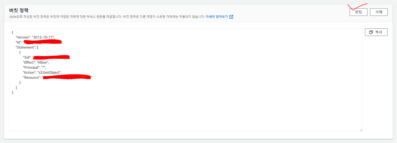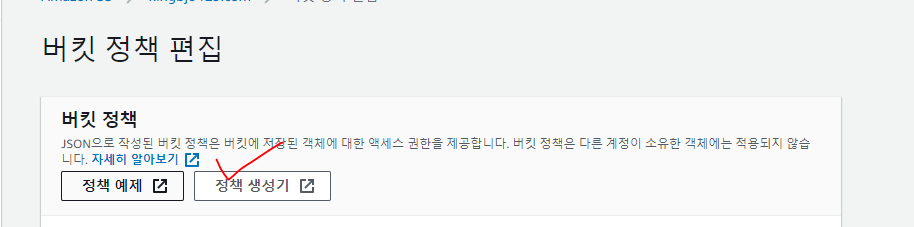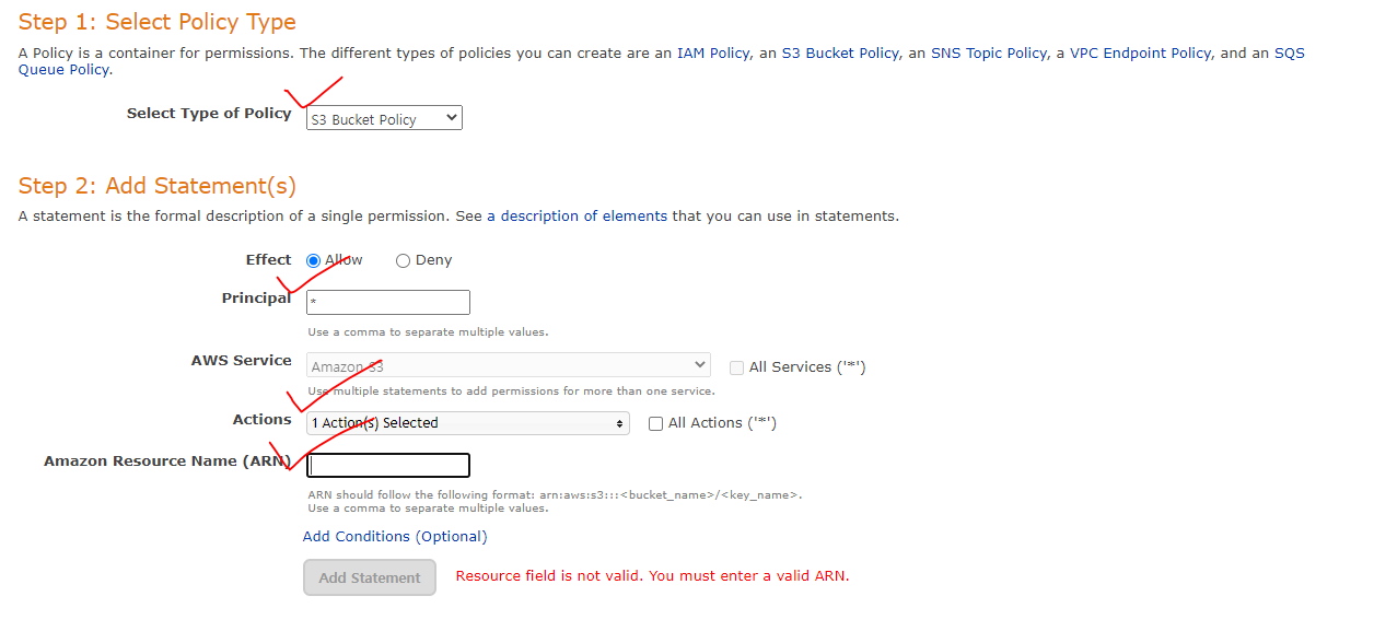 ์ฒดํฌ๋ ๋ถ๋ถ์ ์์ ํด์ค๋๋ค.select Type of Policy : S3 Bucket PolicyPrincipal : *Actions : GetObjectARN : ์๋ง์กด ๋ฆฌ์์ค ์ด๋ฆ(์๋ ๋๋ฒ์งธ ์ด๋ฏธ์ง ์ฐธ๊ณ )
