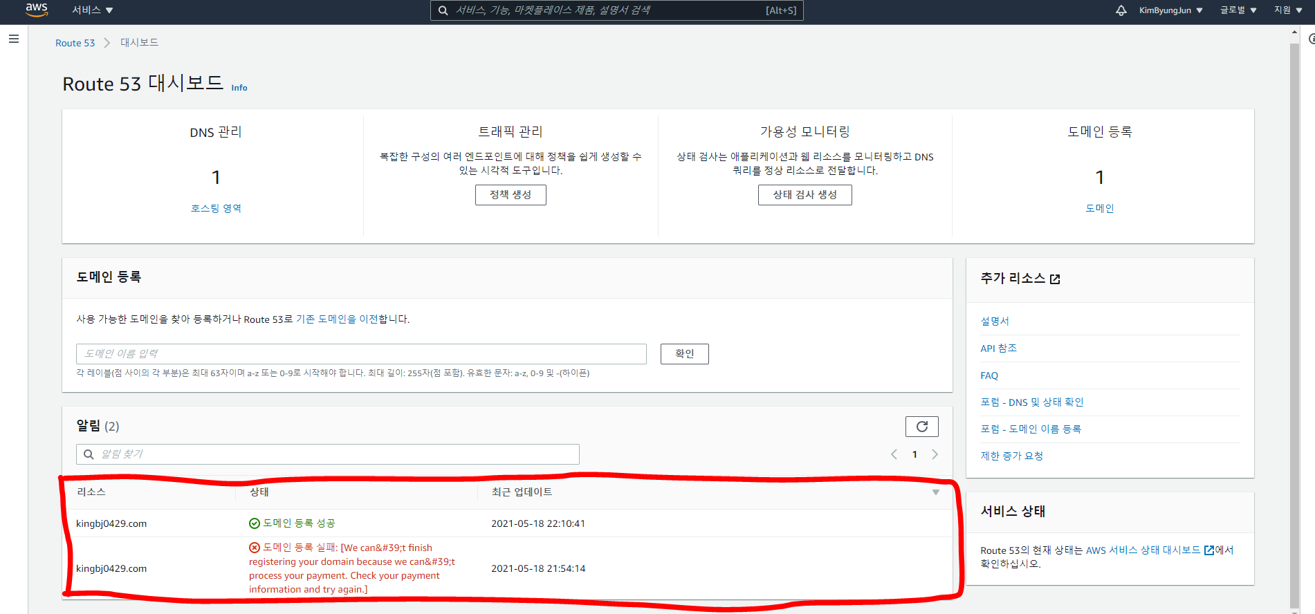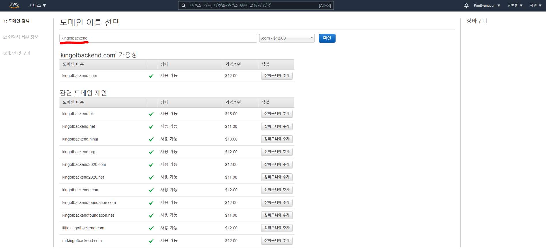 AWS๋ 1๋ ๊ธฐ์ค ํํ 15,000์(com ๊ธฐ์ค, 12$) ์ ๋์ ๋๋ค. ์นดํ24๊ฐ 22,000์, ๊ฐ๋น์๊ฐ 13,500์ ํ๋ ๊ฒ ๊ฐ์ต๋๋ค. ์นดํ24์์ .com์ด ๋ฑ๋ก๋ถ๊ฐ๋ฅ์ธ๋ฐ ์ด๊ฑด aws๋ก ์ ๊ฐ ์ด๋ฏธ ๊ตฌ๋งคํด์ ๋ถ๊ฐ๋ฅ์ด๋ผ๊ณ ๋์ค๋ ๊ฒ๋๋ค.