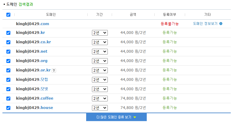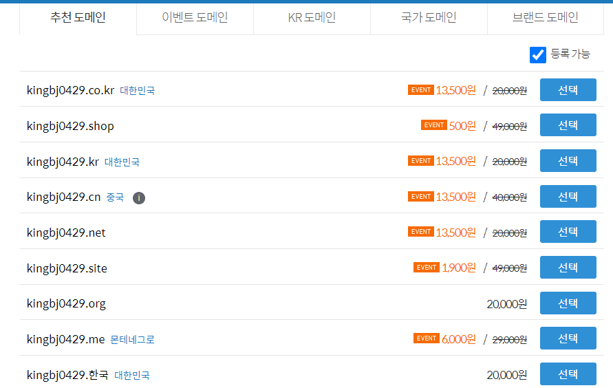 ์ํ๋ ๋๋ฉ์ธ ์ด๋ฆ์ ์์ฑํ๊ณ ํ์ธ์ ๋๋ฌ์ค๋๋ค. ๊ทธ๋ฌ๋ฉด ์ฌ์ฉ๊ฐ๋ฅํ ์ฌ๋ฌ ๊ฐ์ ๋๋ฉ์ธ ๋ฆฌ์คํธ๊ฐ ์ญ์ฑ ๋์ต๋๋ค. ๋ง์ฝ ๋๊ตฐ๊ฐ ์ฌ์ฉํ๊ณ ์๋ค๋ฉด ์ฌ์ฉ ๋ถ๊ฐ๋ฅ์ด ๋น๋๋ค. ์ํ๋ ๋๋ฉ์ธ์ ์ฅ๋ฐ๊ตฌ๋์ ์ถ๊ฐ ํ ํ ๊ฒฐ์ ๋ฅผ ํด์ค๋๋ค.