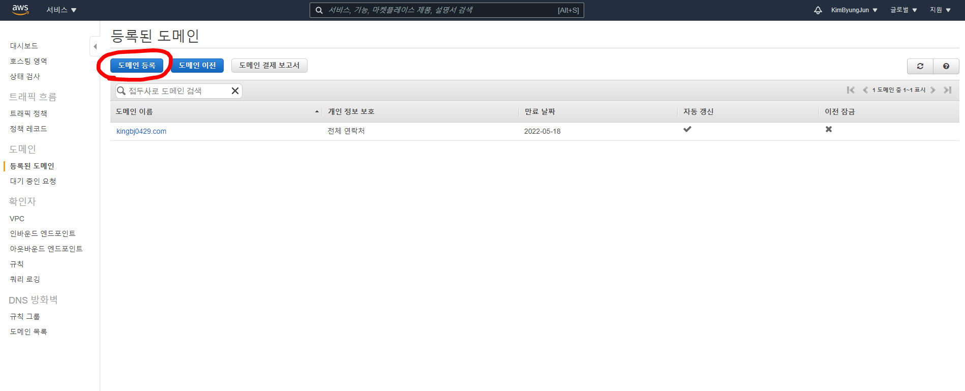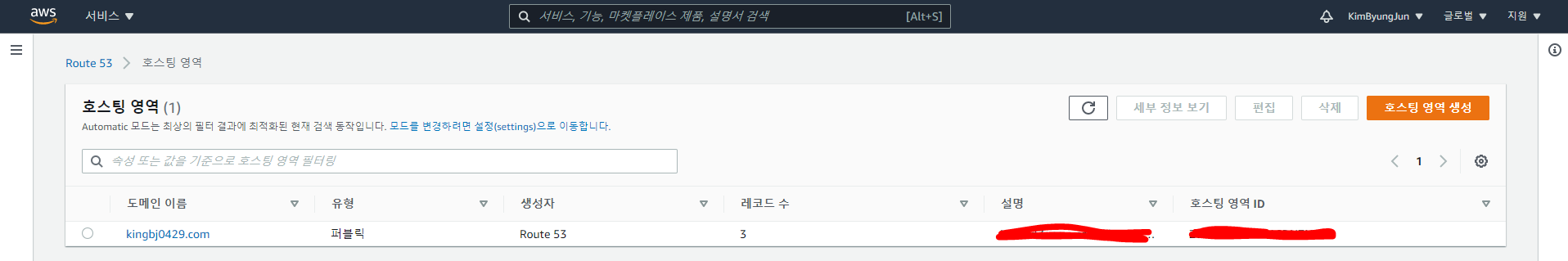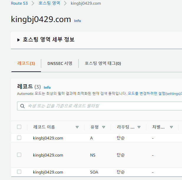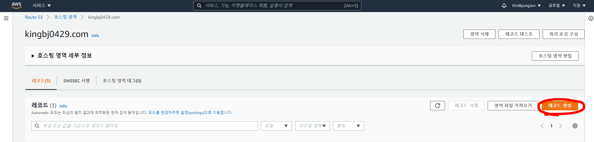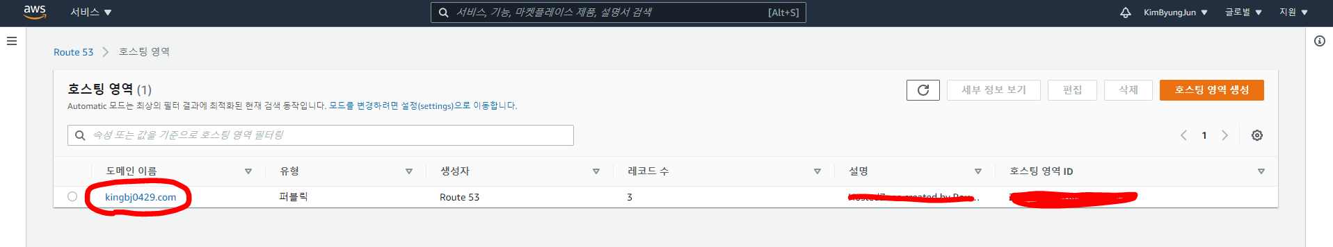 ๋ค์ Route 53์ ํธ์คํ ์์ญ์ผ๋ก ์ด๋ํด์ค๋๋ค. ์ดํ ๋๋ฉ์ธ ์ด๋ฆ์ ํด๋ฆญํด์ค๋๋ค.