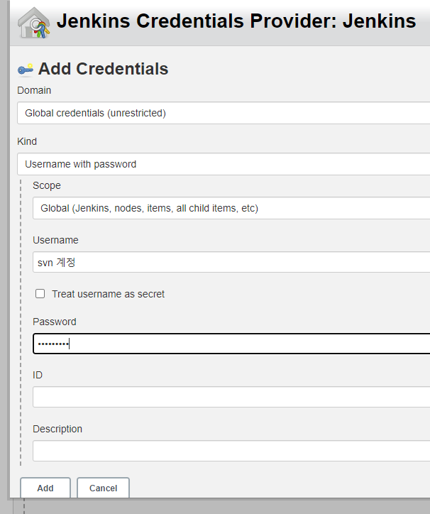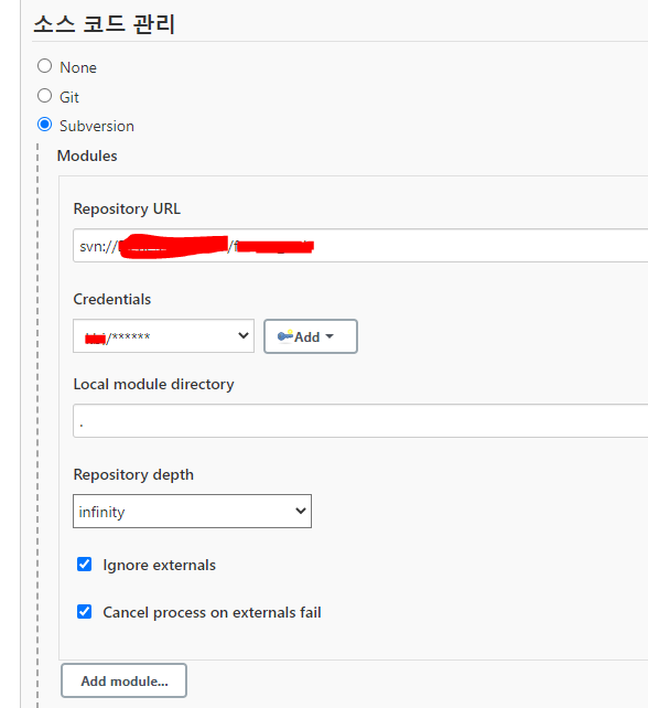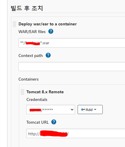 ๋ฐฐํฌํ ํฐ์บฃ์ ์ค์ ํ๋ ๊ณณ์ ๋๋ค. ํ์ฌ ์๋ฒ์ ๋ง๋ ํฐ์บฃ์ ์ค์ ํด์ค์ผ ํฉ๋๋ค. ๊ทธ๋ฆฌ๊ณ ์ด ๋ถ๋ถ์ Credentials๋ SVN ๊ณ์ ์ด ์๋ tomcat-users.xml์์ ์ค์ ํ ๊ณ์ ์ ์์ฑํด์ฃผ์ด์ผ ํฉ๋๋ค.