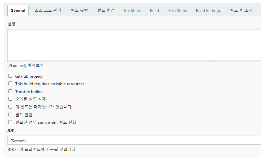 Global Tool Configuration์์ JDK์ ์ค์ ํ๋ฉด General์์ JDK๊ฐ ๋ณด์ ๋๋ค. ํ์ง๋ง ์๋ฌด๊ฒ๋ ์ค์ ํ์ง ์์ผ๋ฉด JDK ๋ชฉ๋ก์ด ์๋ณด์ ๋๋ค.