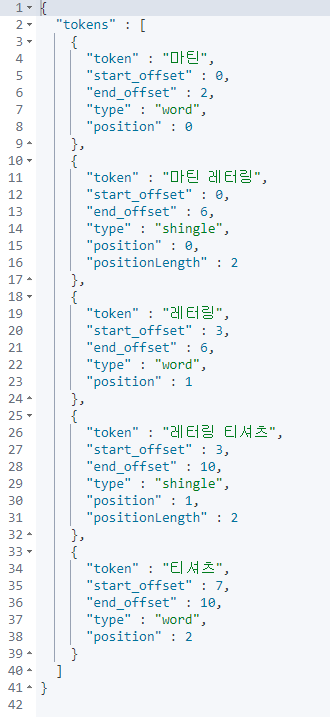 analyzer๋ ์ปค์คํ analyzer ์ฌ์ฉํ์ต๋๋ค. tokenizer๋ nori๋ฅผ ์ฌ์ฉํ์๊ณ , filter๋ shingle๋ฅผ ์ฌ์ฉํ์์ต๋๋ค.