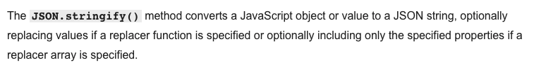 - JS Object๋ฅผ JSON์ผ๋ก ๋ณํํด์ฃผ๊ธฐ ์ํด ํ์ํ ๊ฒ์ด JSON.stringify() ๋ฉ์๋๊ฐ ๋๋ ๊ฒ์ ๋๋ค.
