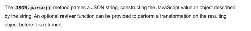JSON.parse()๋ JSON์ JavaScript Object๋ก ๋ณ๊ฒฝํด์ฃผ๊ธฐ ์ํด ์ฌ์ฉ๋๋ ๋ฉ์๋์ ๋๋ค.
