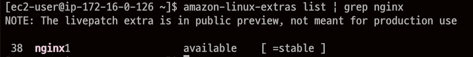 amazon-linux-extras list ๋ช ๋ น์ด๋ฅผ ํตํด ์ค์นํ nginx๋ฅผ ์ฐพ์๋ณด๊ฒ ์ต๋๋ค.