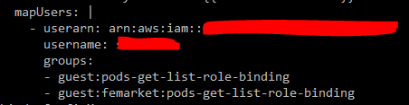 - rolearn: <arn:aws:iam::111122223333:role/eksctl-my-cluster-nodegroup-standard-wo-NodeInstanceRole-1WP3NUE3O6UCF>