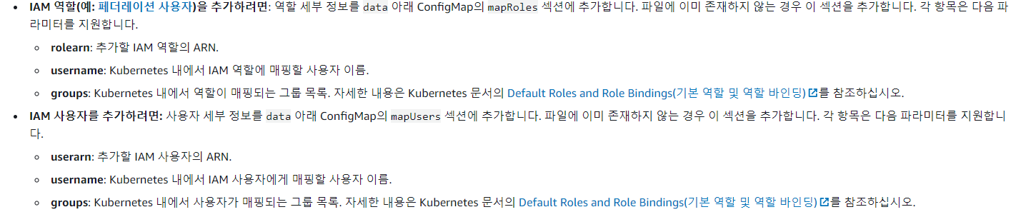"Amazon EKS ํด๋ฌ์คํฐ๋ฅผ ์์ฑํ ๊ฒฝ์ฐ, ํด๋ฌ์คํฐ๋ฅผ ์์ฑํ๋ IAM ์ํฐํฐ ์ฌ์ฉ์ ๋๋ ์ญํ (์: ํ๋๋ ์ด์ ์ฌ์ฉ์)์๋ ์ ์ด ์์ญ์ ํด๋ฌ์คํฐ RBAC ๊ตฌ์ฑ์ system:masters ๊ถํ์ด ์๋์ผ๋ก ๋ถ์ฌ๋ฉ๋๋ค. ์ด IAM ์ํฐํฐ๋ ConfigMap ๋๋ ๊ธฐํ ํ์๋๋ ๊ตฌ์ฑ์ ๋ํ๋์ง ์์ผ๋ฏ๋ก ํด๋ฌ์คํฐ๋ฅผ ์๋ ์์ฑํ IAM ์ํฐํฐ๋ฅผ ์ถ์ ํด์ผ ํฉ๋๋ค. AWS ์ฌ์ฉ์๋ ์ญํ ์ ํด๋ฌ์คํฐ์ ์ํธ ์์ฉํ ์ถ๊ฐ ๊ถํ์ ๋ถ์ฌํ๋ ค๋ฉด Kubernetes ๋ด์์ aws-auth ConfigMap์ ํธ์งํด์ผ ํฉ๋๋ค."