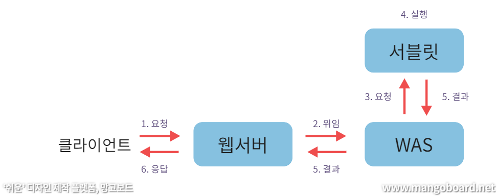 ν΄λΌμ΄μΈνΈκ° μΉ μλ²μ μμ²μ νλ©΄ μΉ μλ²λ κ·Έ μμ²μ ν°μΊ£κ³Ό κ°μ μΉ μ ν리μΌμ΄μ μλ²(WAS)μ μμν©λλ€. κ·Έλ¬λ©΄ WAS λ κ° μμ²μ ν΄λΉνλ μλΈλ¦Ώμ μ€νν©λλ€. κ·Έ ν μλΈλ¦Ώμ μμ²μ λν κΈ°λ₯μ μνν ν κ²°κ³Όλ₯Ό λ°ννμ¬ ν΄λΌμΈνΈμκ² μλ΅νκ² λ©λλ€.