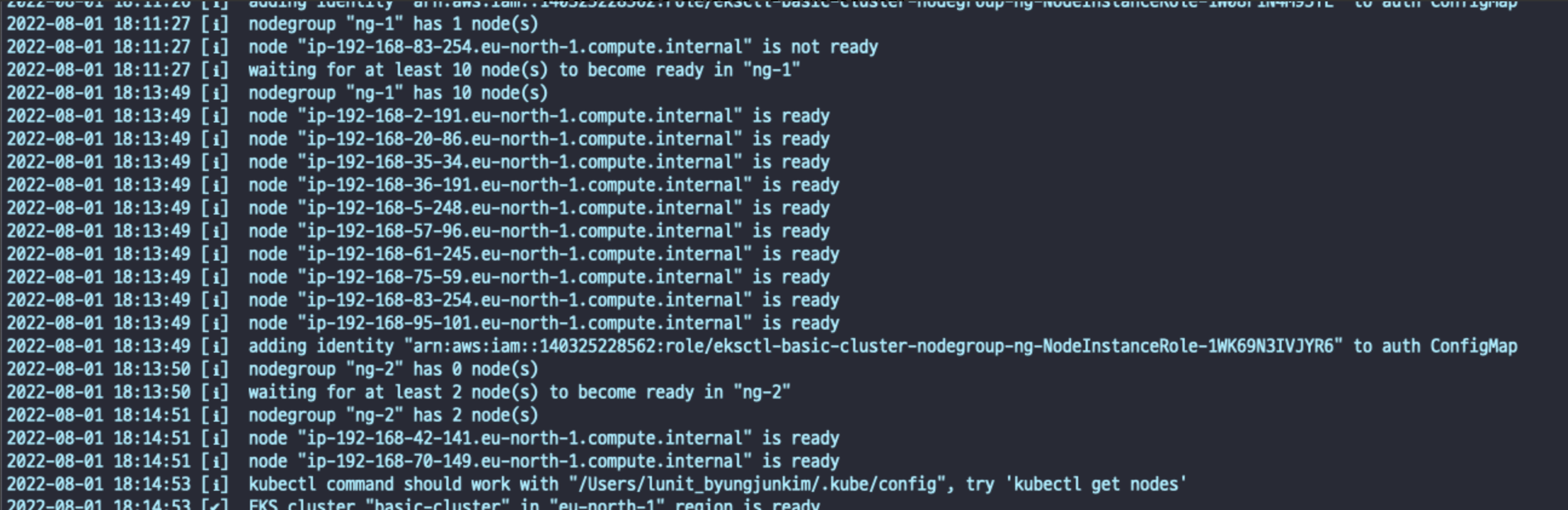 - nodeGroups[0].ssh : ํค์ ์์น๋ฅผ ๋ช ์ํ์ง ์์ผ๋ฉด ์๋์ผ๋ก ~/.ssh/id_rsa.pub ์ ๋ฐ๋ผ๊ฐ