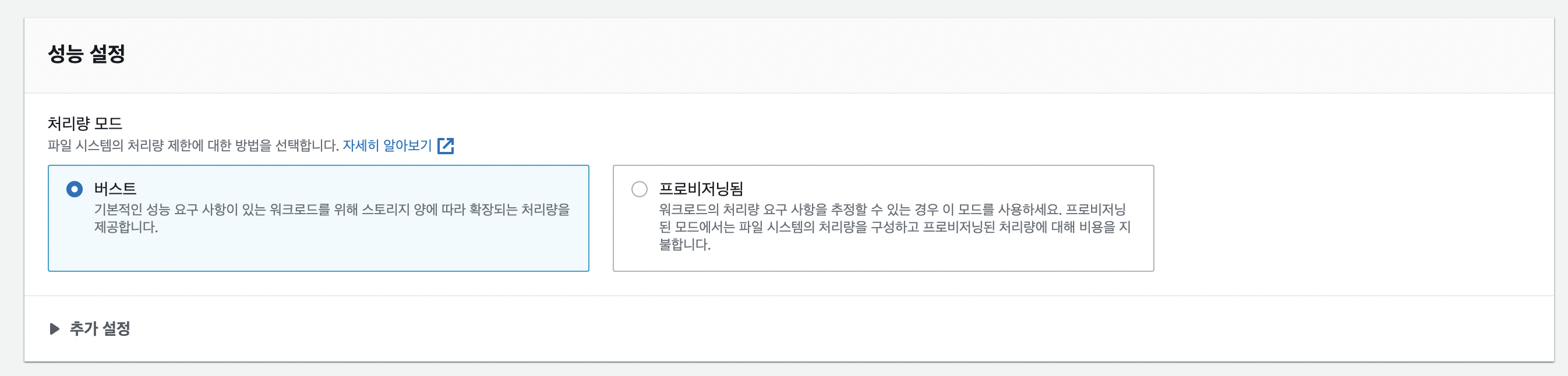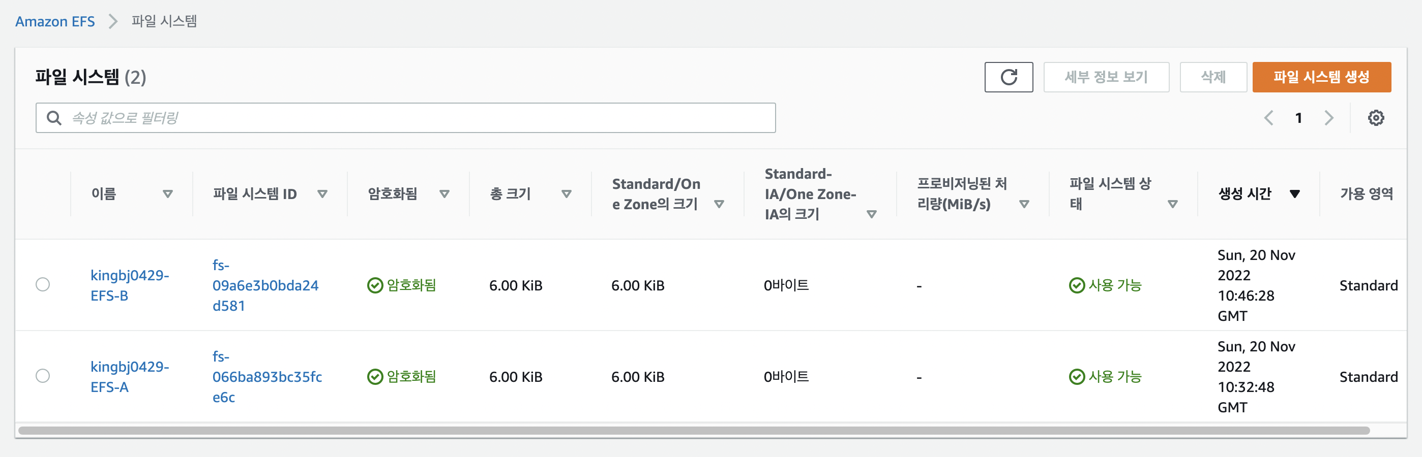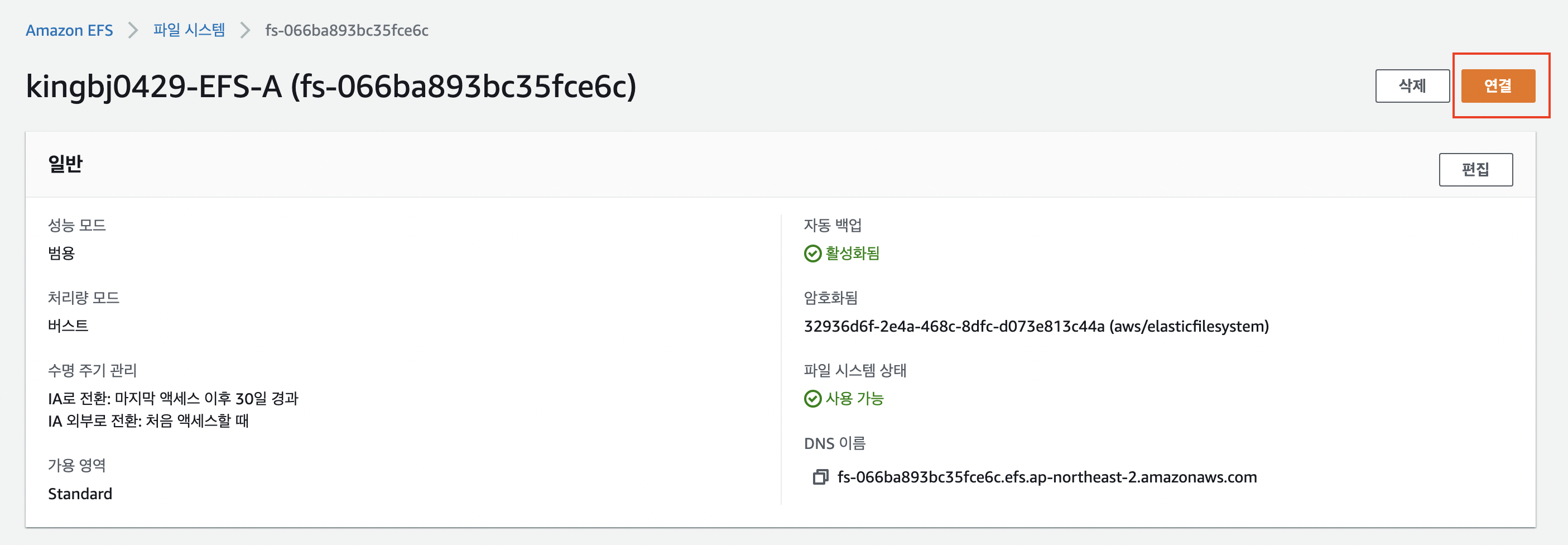 - VPC ๋ด EFS A 1๊ฐ ์์ฑ ํ EC2 ์ ๋ง์ดํธ