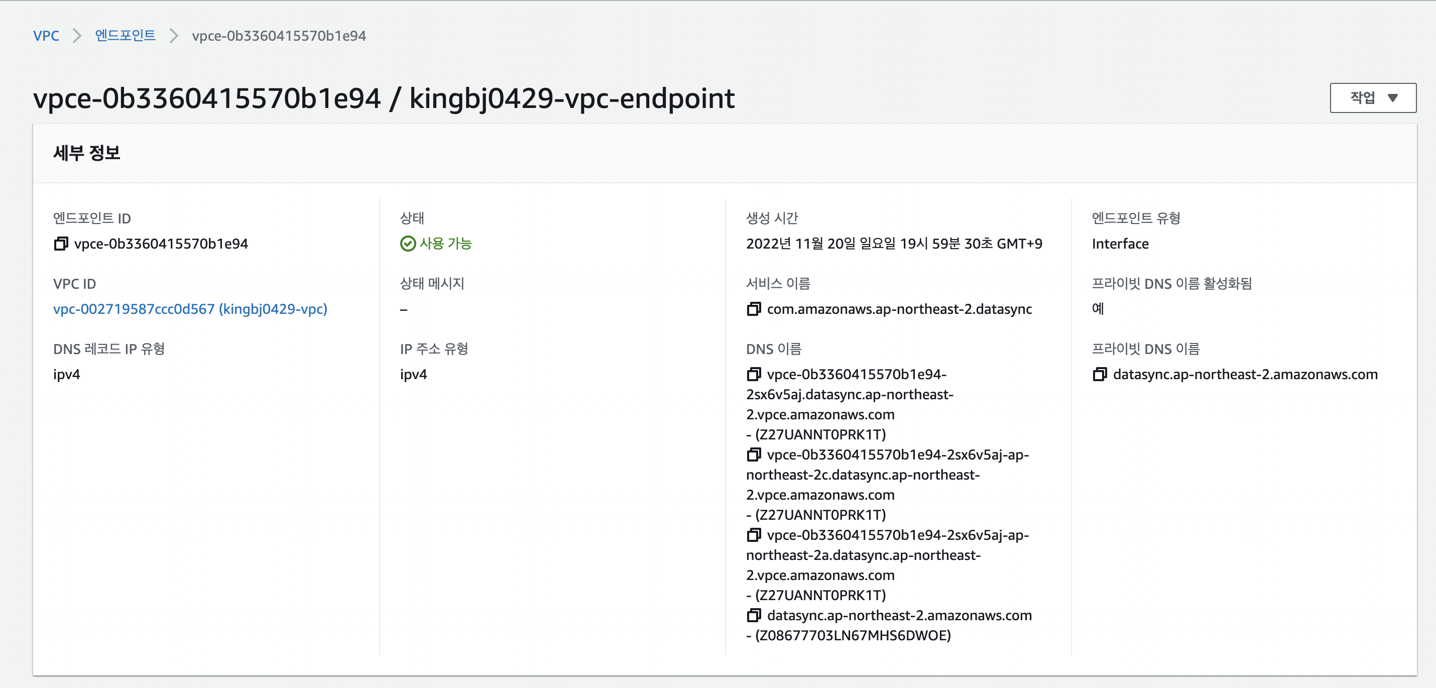 VPC EndPoint ์์ ์๋น์ค๋ ๋ฐ๋์ datasync ๋ก ํ๊ณ , ๋ณด์๊ทธ๋ฃน์ ์๋์ ๊ฐ์ด ๋ง๋ค์ด์ฃผ์ ์ผ ํฉ๋๋ค.