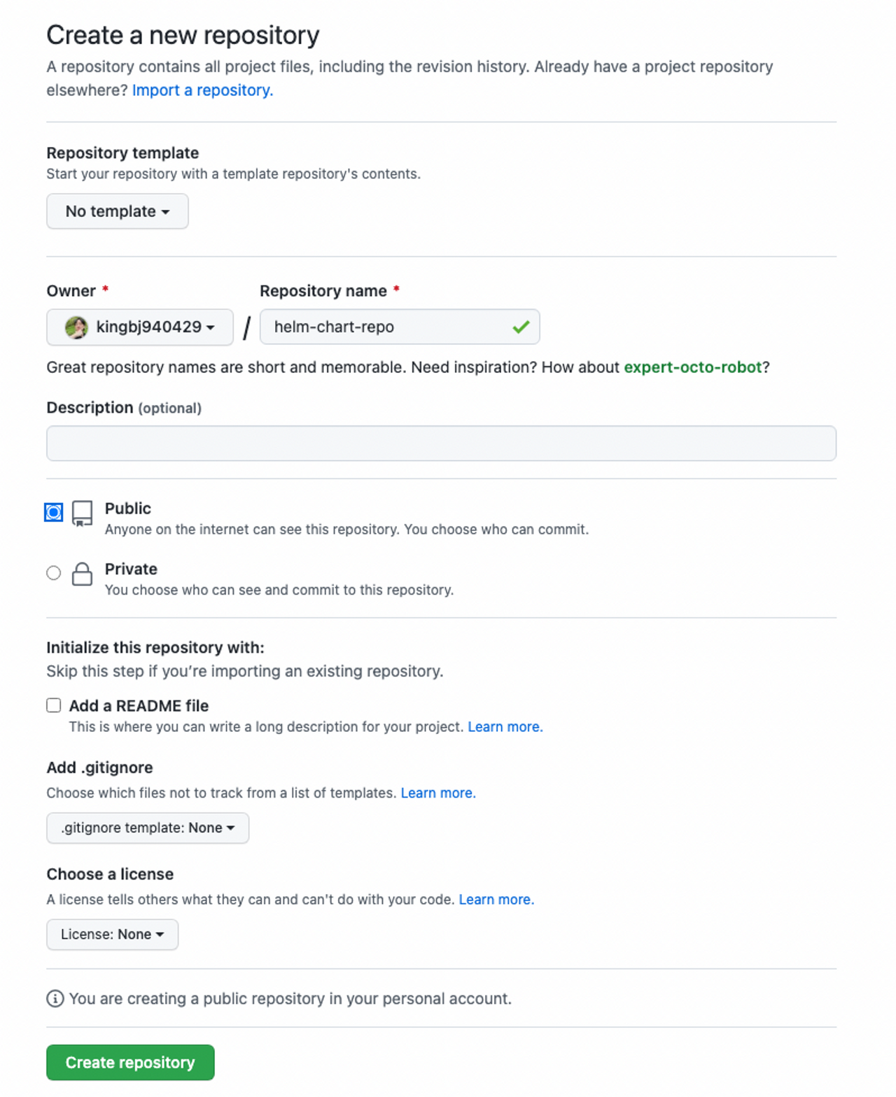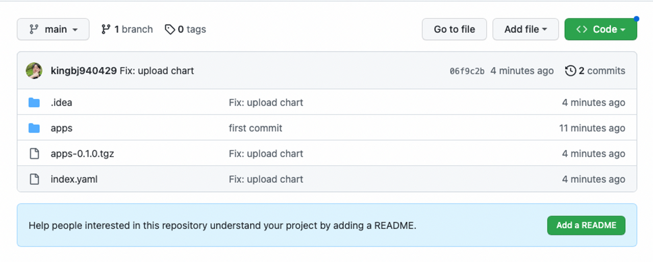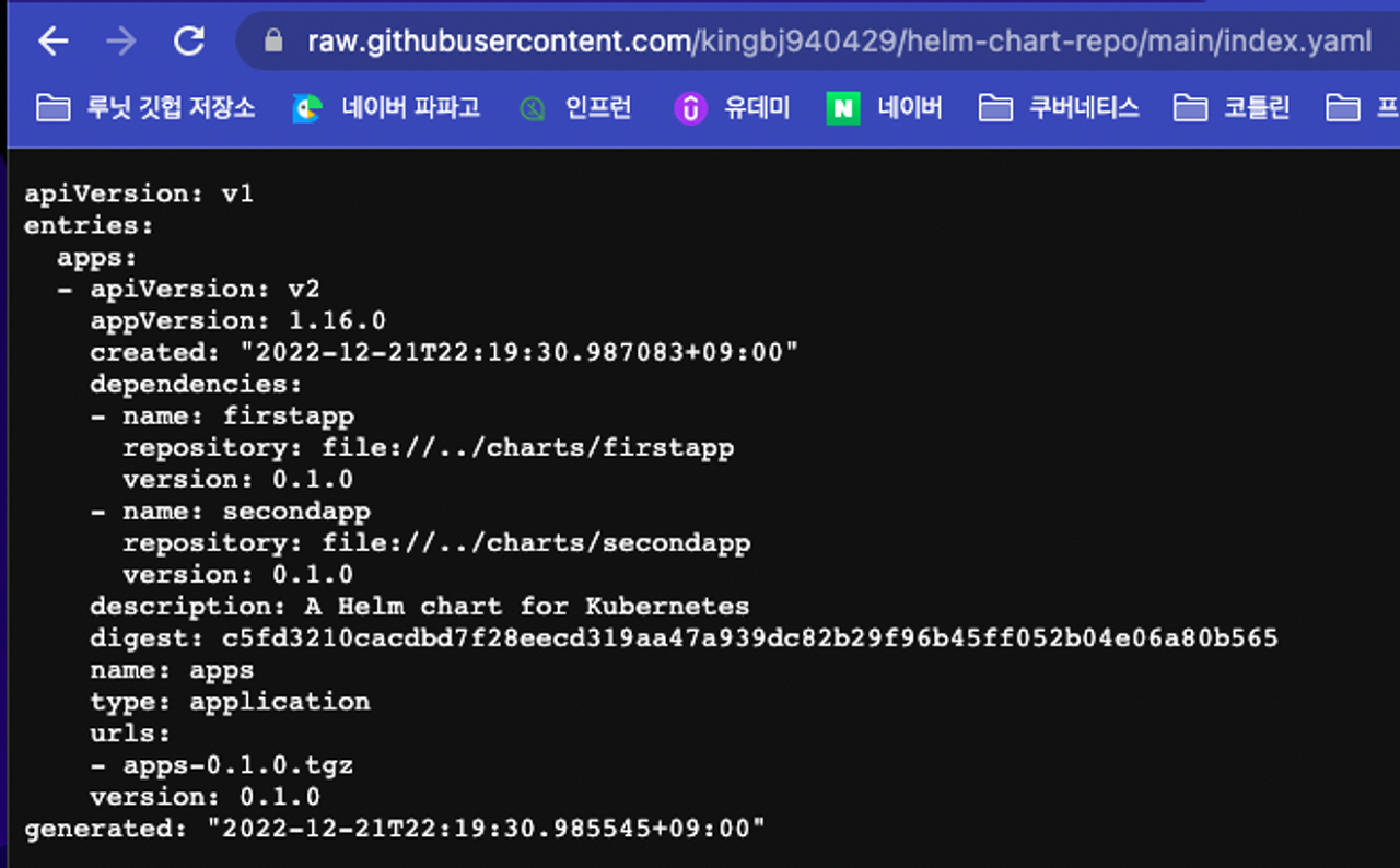 $ helm repo add helm-chart-repo <https://raw.githubusercontent.com/kingbj940429/helm-chart-repo/main>