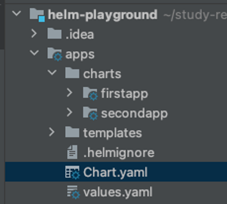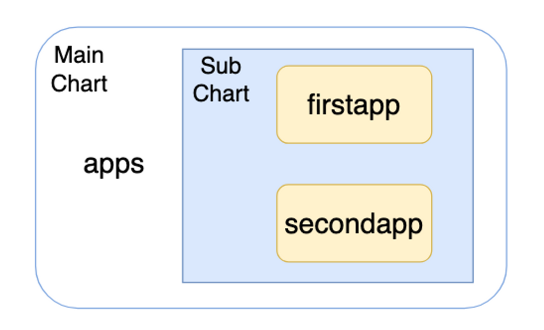 apps ๋ผ๋ Main Chart ๊ฐ ์๊ณ , ์์ firstapp ๊ณผ secondapp ์ด๋ผ๋ Sub Chart ๊ฐ ์๋ ๊ตฌ์กฐ์ ๋๋ค.