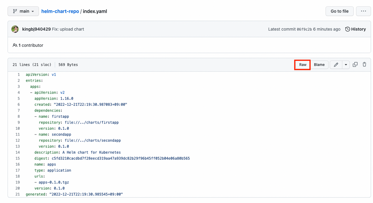 Helm Chart Repo ๋ index.yaml ๊ธฐ๋ฐ์ผ๋ก ๋์์ ํ๊ฒ ๋ฉ๋๋ค. index.yaml ๋ก ์ด๋ํ ํ Raw ๋ฒํผ์ ๋๋ฌ์ค๋๋ค.
