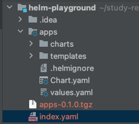 ๊ทธ๋ฌ๋ฉด apps-0.1.0.tgz ๋ผ๋ ์์ถํ์ผ์ด ์์ฑ๋๋๋ฐ tgz ๋ index.yaml ์ด๋ผ๋ ํ์ผ์ ์ํด ๊ด๋ฆฌ๋ฉ๋๋ค.