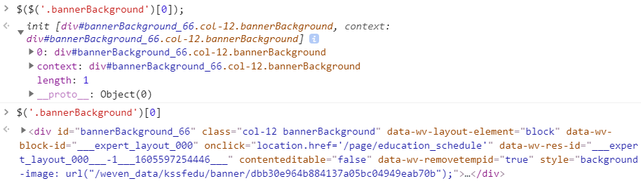 ๋ฐ๋ผ์ $($('.bannerBackground')[0]) ์ฝ๋๋ $('.bannerBackground')[0] ์ ํด๋นํ๋ ํ๊ทธ๋ฅผ ๊ฐ์ ธ์จ ํ ๊ฐ์ ธ์จ ํ๊ทธ์ ๋ํด ๋ค์ ์ ์ด์ฟผ๋ฆฌ๋ก ๊ฐ์ธ์ฃผ๋ฉด์ ์ ์ด์ฟผ๋ฆฌ ํจ์๋ค์ ์ฌ์ฉํ ์ ์๊ฒ ํด์ฃผ๋ ๊ฒ์