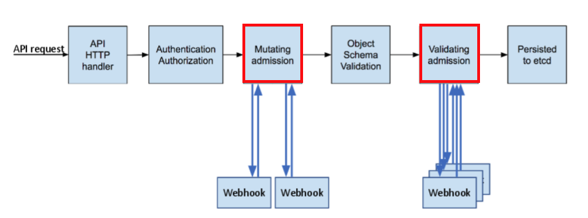 ์ด ๊ทธ๋ฆผ์ด ๋ฐ๋ก Admission Controller ์ Phases ์ด์ฃ . ์ธ์ฆ(Authentication)/์ธ๊ฐ(Athorization) ๋ฅผ ๊ฑฐ์น ํ Mutating Admission ๊ณผ Validating Admission ์ด API Request ๋ฅผ ๊ฐ๋ก์ฑ๊ฒ ๋๋๋ฐ ์ด 2๊ฐ๊ฐ Admission Controller ์ ์ปดํฌ๋ํธ์ ๋๋ค.