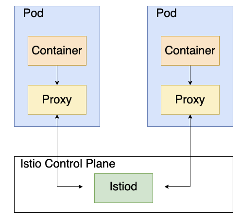νλ μμ SideCar λ‘ Proxy κ° μκΈ°κ² λλ λ° μ΄ Proxy κ° κ³§ Istio μ λλ€. κ·Έλ¦¬κ³ Proxy λ Istiod μ μν΄ κ΄λ¦¬λ©λλ€.