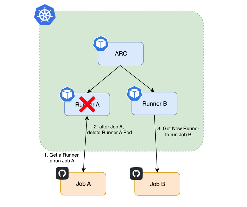 Action Controller Runner (์ดํ ARC) ๋ ํ๋ ๋จ์ Self Hosted Runner ์ ๋๋ค.