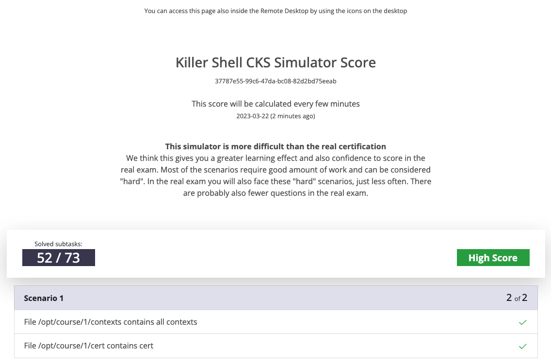 CKS ๋ฅผ ์์ํ๋ฉด Killer.sh ์์ ๋ชจ์๊ณ ์ฌ๋ฅผ ๋ณผ ์ ์๋ ์ธ์ ํฐ์ผ 2์ฅ์ ์ค๋๋ค. ์ธ์ ๋น 36์๊ฐ๋ง ์ ํจํ๊ณ , ์ค์ ์ํ๊ณผ ๋น์ทํ ํ๊ฒฝ์ ์ ๊ณตํด์ค๋๋ค. ๊ทธ๋ฆฌ๊ณ 2์ฅ์ด์ง๋ง ๋ฌธ์ ๋ ์์ ํ ๋์ผํด์.