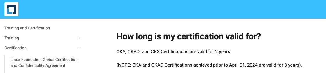 CKA, CKAD ๋ํ 3๋ ์์ 2๋ ์ผ๋ก ์ค์์ต๋๋ค. ๋ฐ๋ผ์ CKA, CKAD, CKS ๋ชจ๋ ์ ํจ๊ธฐ๊ฐ์ 2๋ ์ ๋๋ค.