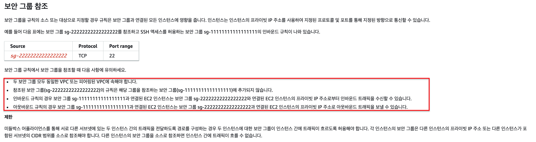 ์๋ฅผ ๋ค์ด DB ์ธ์คํด์ค์ App ์ธ์คํด์ค๊ฐ ์์ ๋, ์ด 2๊ฐ์ ์ธ์คํด์ค๋ ์๋ก๋ง ํต์ ์ ํ๊ณ ์ถ์ต๋๋ค. ์ด๋ ๊ฐ๊ฐ ๋ณด์ ๊ทธ๋ฃน์ CIDR ๋ธ๋ก์ ์ง์ ํ ํ์ ์์ด ์๋ก์ ๋ณด์ ๊ทธ๋ฃน์ ์์ค๋ก ์ง์ ํ๋ฉด ๋ฉ๋๋ค.