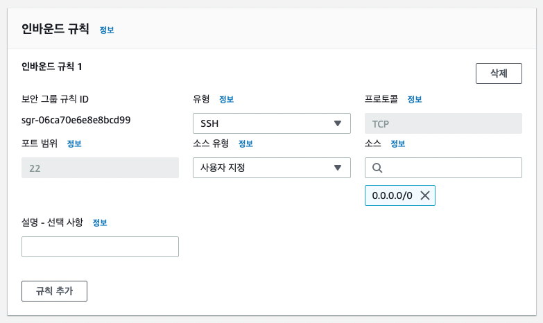 SSH ๋ฅผ ์ํ ๊ท์น ๋ง๊ณ ๋ ํน๋ณํ ์์ต๋๋ค. ์์ค ๋ํ 0.0.0.0/0 ์ผ๋ก ํ๊ธฐ ๋๋ฌธ์ ์ด๋์๋ 22๋ฒ ํฌํธ(SSH) ๋ก ์ ๊ทผํ ์ ์์ต๋๋ค.
