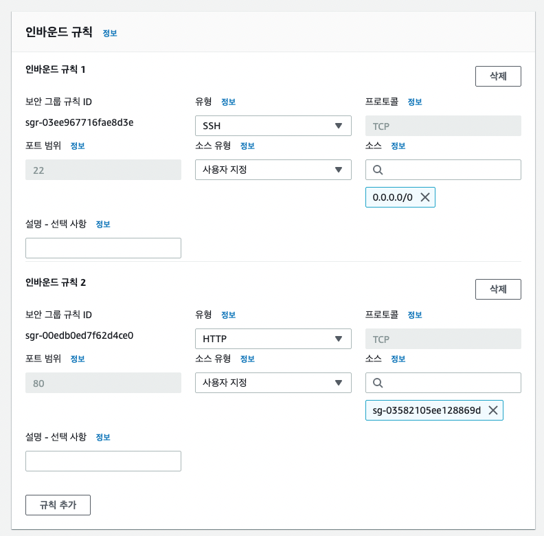 ๊ทธ๋ฆฌ๊ณ Security Group 2 ์ ์ธ๋ฐ์ด๋ ๊ท์น๋ ์ดํด๋ณด์ฃ .