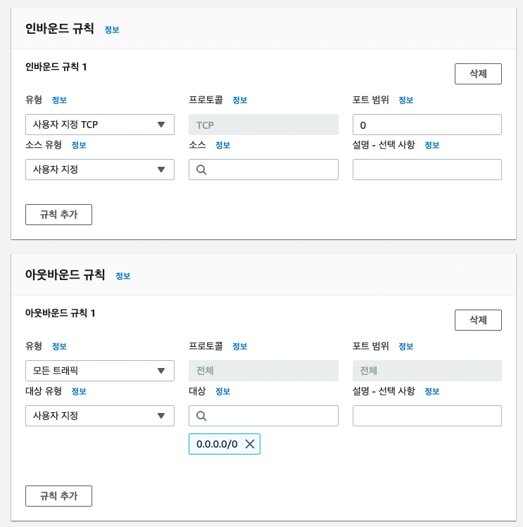 - 0.0.0.0/0 ์ผ๋ก ๊ท์น์ ์ ํ๋ฉด ๋ชจ๋ IP ๋ก๋ถํฐ ๋ค์ด์ค๋ ํธ๋ํฝ์ Allow