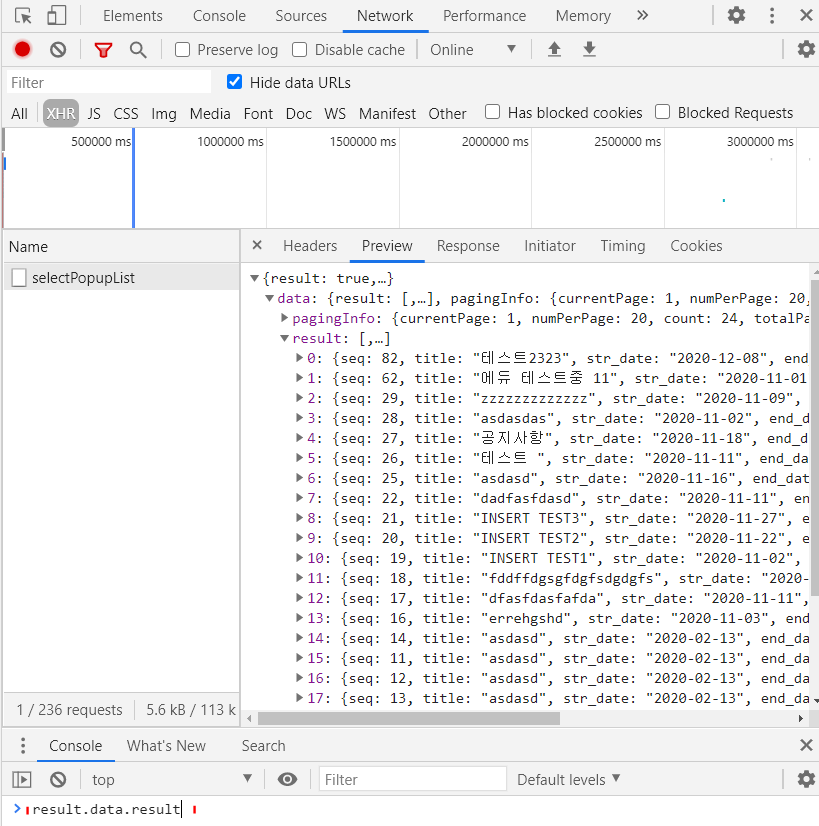 κ²°κ΅ κ°λ°μ λꡬ μ½μμμ result.data.result μ μ κ·ΌνκΈ° μν΄μλ ν΄λΌμ΄μΈνΈλ‘ λ°μ΄ν° κ°μ λ³΄λΌ λ ν μμμ κ°μ²΄ μμ λ£μ΄μ£Όλ©΄ λ©λλ€.