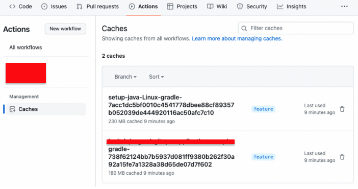 ๊ทธ๋ฆฌ๊ณ ์ด ์บ์๋ ์ฌ๊ธฐ์ ํ์ธํ ์ ์์ต๋๋ค. ์์์ ์์ฑ๋ 2๊ฐ์ ์บ์ ํค์ ๋๋ค. setup-java-linux-gradle-xxx ๋ผ๋ ์บ์ ํค ์ด๋ฆ์ actions/setup-java@v3 ์์ ์์ฑํด์ฃผ๋ ๊ฒ์ด๋ฉฐ, <repo name>-gradle-xxxx ๋ actions/cache@v3 ์์ .with.key ์ ๋ช ์ํ ์ด๋ฆ์ ๋๋ค.
