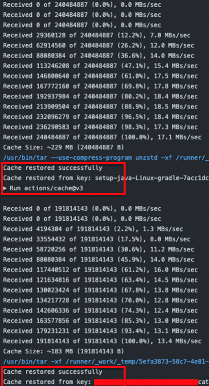 actions/setup-java@v3 ๊ณผ actions/cache@v3 ๋ชจ๋ ์บ์ ํค๋ฅผ ์ด์ฉํด์ ์ ๋ณต์ํ ๊ฑธ ํ์ธํ ์ ์์ต๋๋ค.
