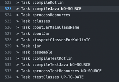์๋๋ gradle build ๊ฐ ์คํ๋ ๋ ์ถ๋ ฅ๋๋ ๋ก๊ทธ์ ๋๋ค. ๋ณด๋ฉด 523 ๋ผ์ธ์ NO-SOURCE ๋ผ๋ ๋ฌธ๊ตฌ๋ฅผ ํ์ธํ ์๊ฐ ์๋๋ฐ ์ด๋ gradle build ๋ฅผ ์งํํ ๋ ์บ์ ๋ฐ์ดํฐ๋ฅผ ์ฌ์ฉํ์ง ์์์ ๋ ์ถ๋ ฅ๋๋ ๋ฌธ๊ตฌ์ ๋๋ค.