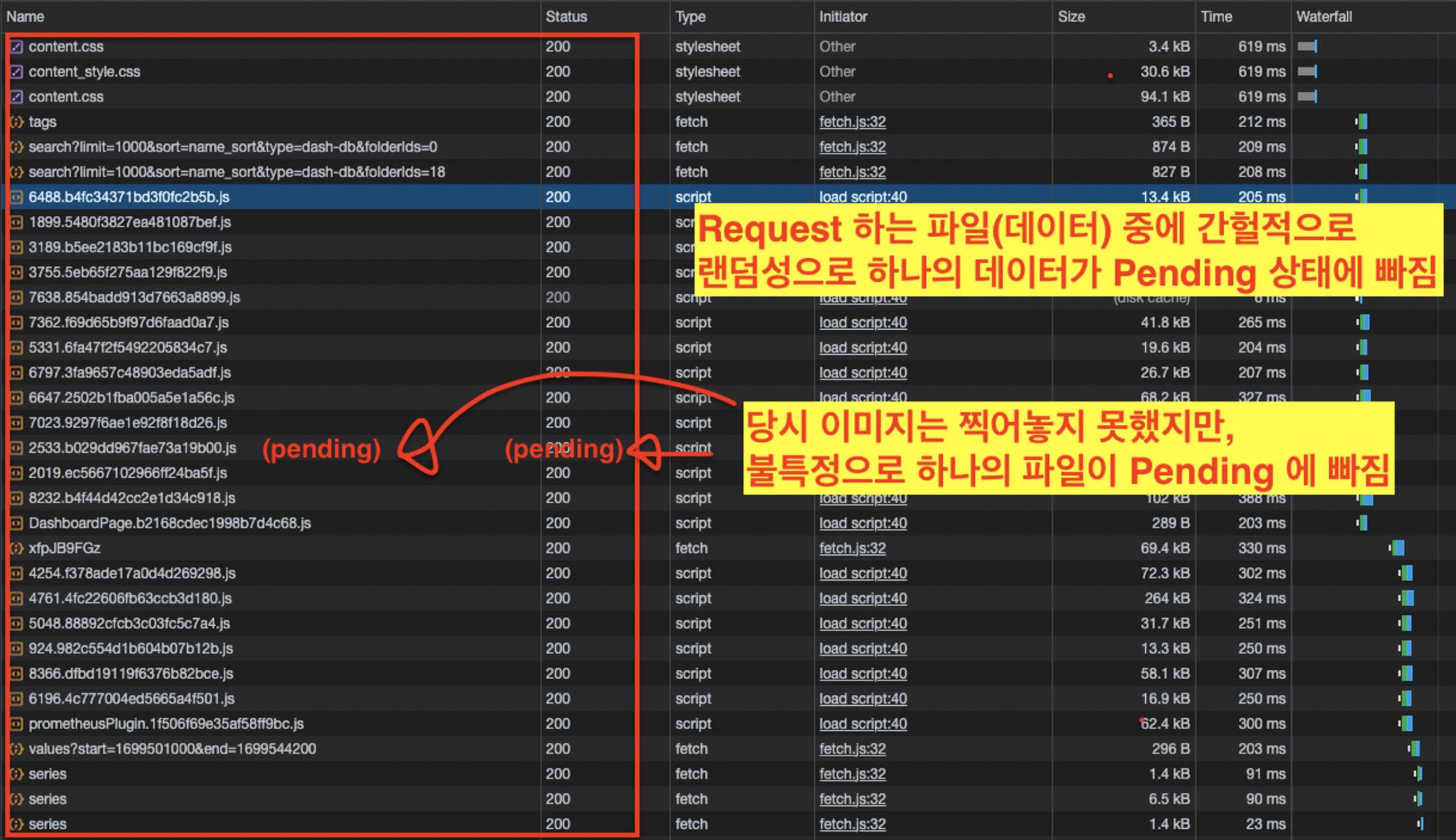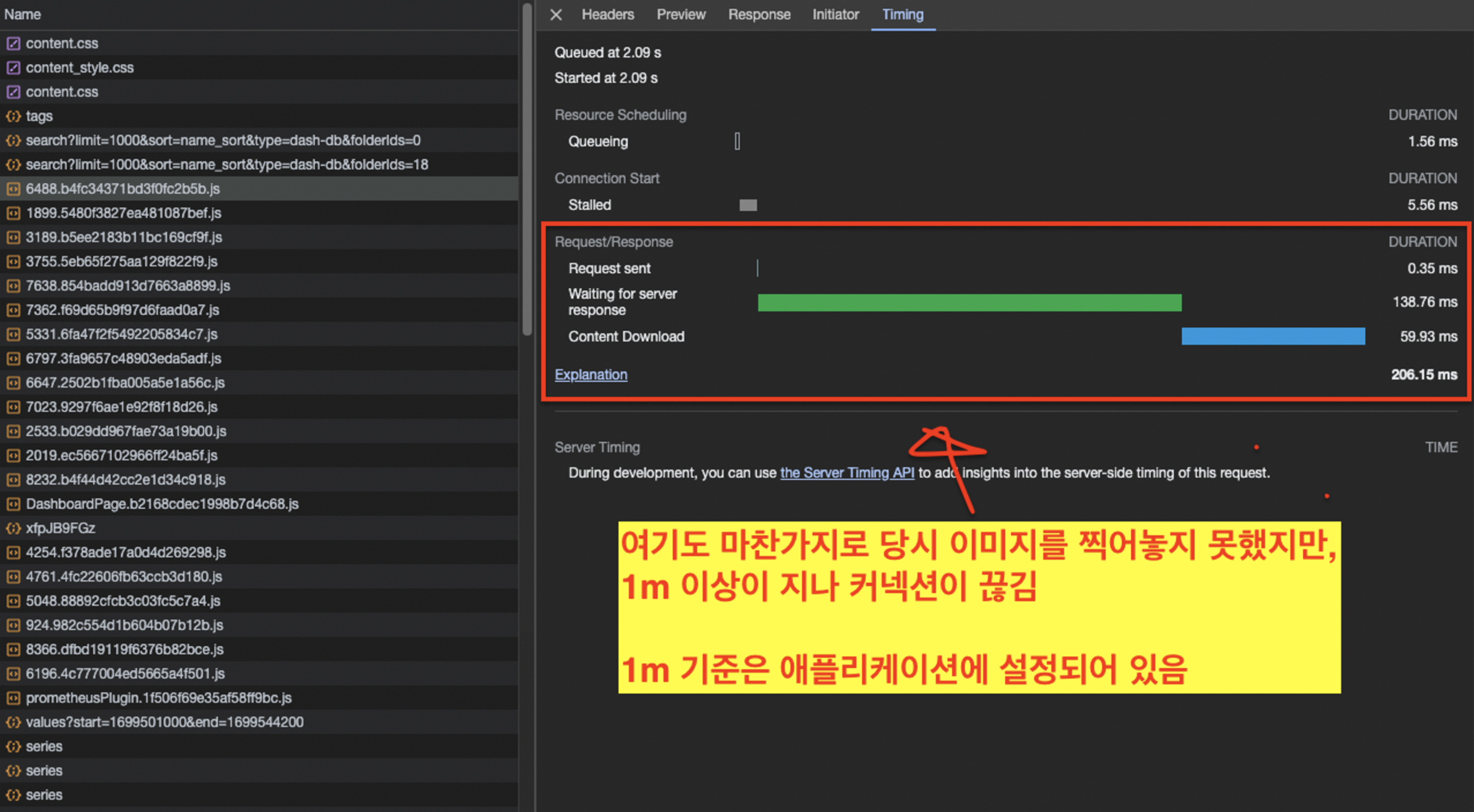 ์ด๊ฒ ๋ฌด์จ ๋ง์ด๋, ์๋ ์ด๋ฏธ์ง์ฒ๋ผ ๊ฐ๋ฐ์ ๋๊ตฌ๋ฅผ ์ผฐ์ ๋ js, css ๋ฑ ์๊ด์์ด ๋๋ค์ผ๋ก ํ๋์ ๋ฆฌ์์ค๋ง pending ์ํ์ ๋น ์ง๊ณ ๊ฒฐ๊ตญ ์ค์ ๋ AWS ์ ์ค์ ๋ Idle Timeout ์ด ์ง๋๋๋ก pending ์ด ์ง์๋์ด ๊ฒฐ๊ตญ ์ปค๋ฅ์ ์ ๋์ด๋ฒ๋ ค 504 Gateway Timeout ์ด ๋ฐ์ํฉ๋๋ค.