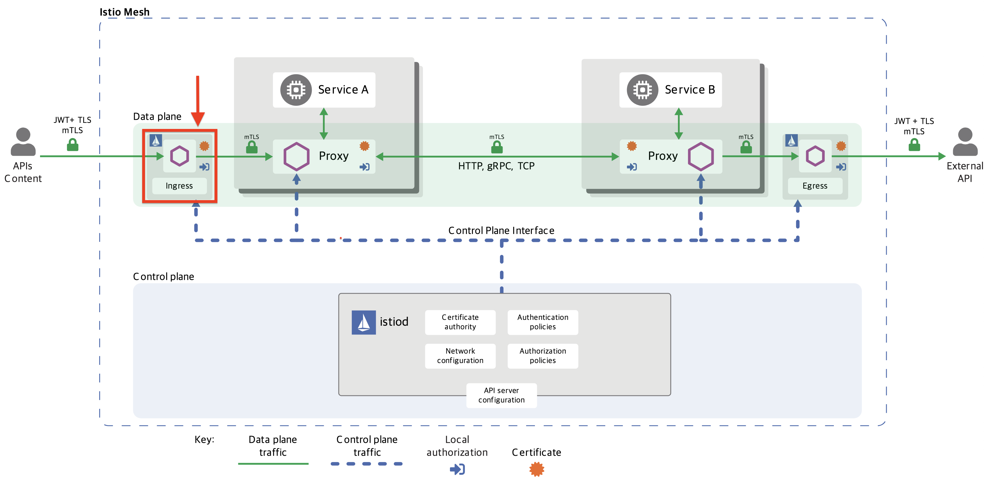 ์ด์คํฐ์ค์๋ Istio Ingress Gateway ๋ผ๋ ์ปดํฌ๋ํธ๊ฐ ์์ต๋๋ค. Istiod ์ ๊ฐ์ ํ์ ์ปดํฌ๋ํธ๋ ์๋์ง๋ง ์ฌ์ค ์ ํ์ ์ปดํฌ๋ํธ ์ ๋๋ค. ์๋ ํด๋ฌ์คํฐ ๋ด๋ถ ์๋น์ค๋ฅผ ํด๋ฌ์คํฐ ์ธ๋ถ์ ๋ ธ์ถํ๊ธฐ ์ํด์ ๋ฐ๋์ ํ์ํ ์ปดํฌ๋ํธ์ด๊ธฐ ๋๋ฌธ์ ๋๋ค.
