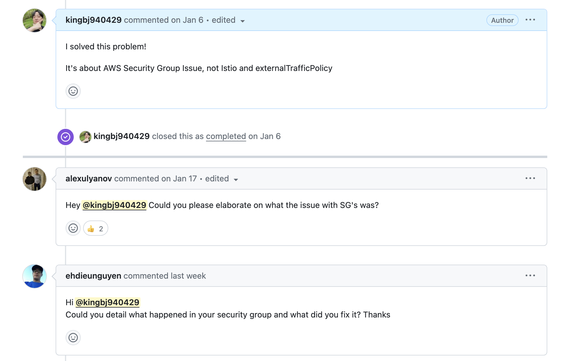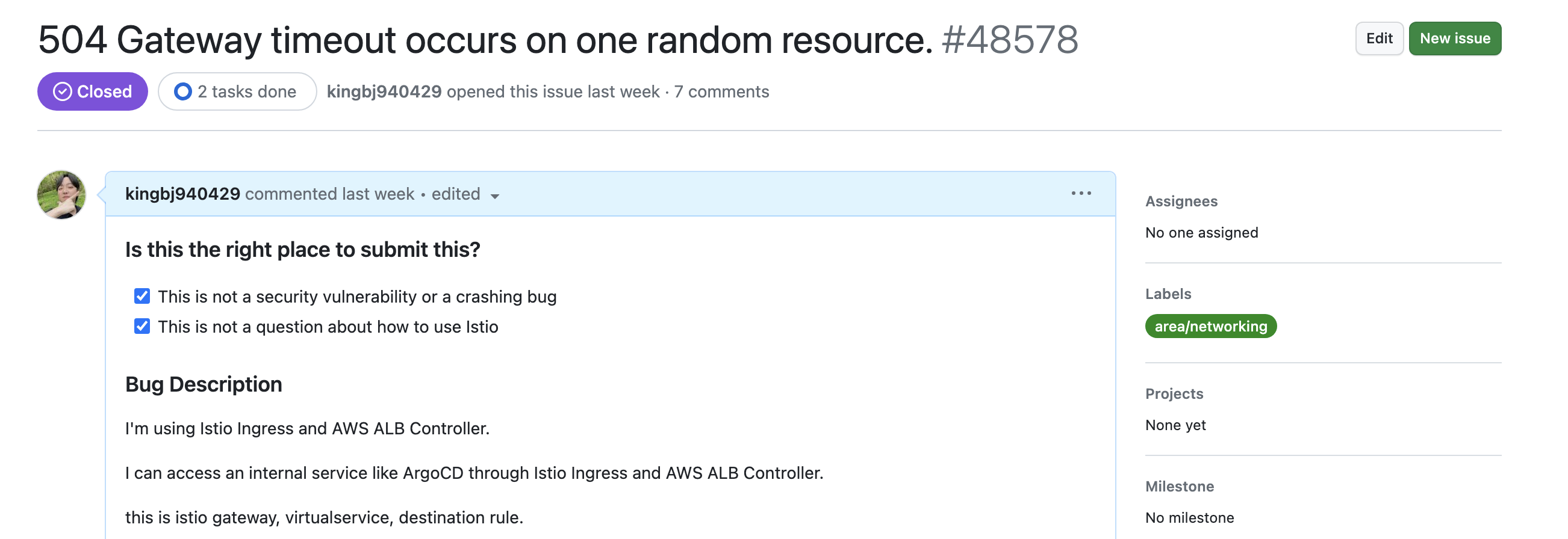 ์, AWS ALB ๋ ๋ฒ์ธ์ด ์๋๋ ๊ฑธ ์์๊ณ ๊ทธ ๋ค์์ผ๋ก Istio ๋ฅผ ์กฐ์ฌํ์ต๋๋ค.