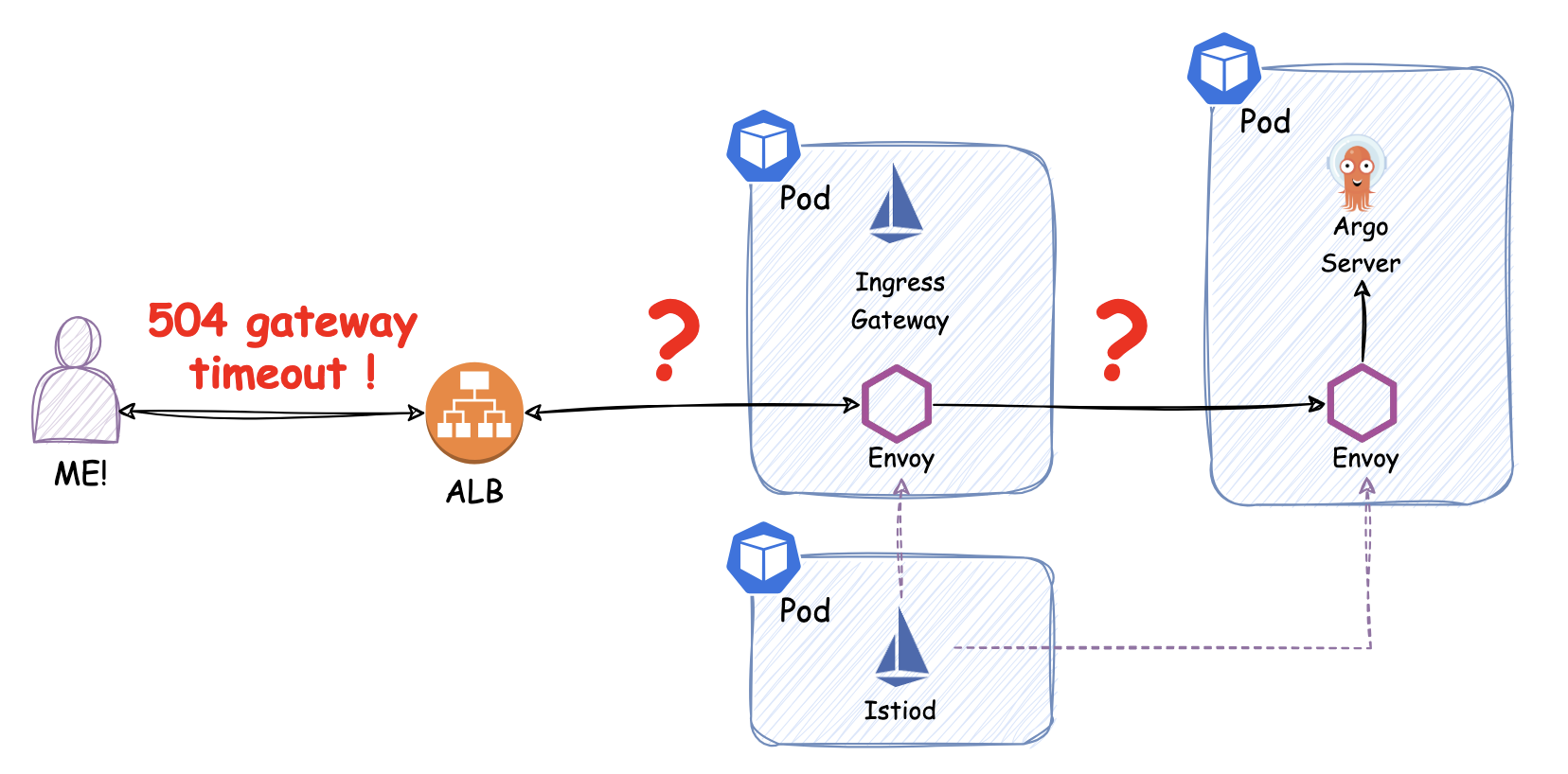 ์์ฌ๋๋ ๋ถ๋ถ์ ํธ๋ํฝ์ ๋ผ์ฐํ ํ๋ AWS ALB ์ Istio ๊ทธ๋ฆฌ๊ณ ๋ด๋ถ ์ ํ๋ฆฌ์ผ์ด์ ์์ฒด(ArgoCD ์ ๊ฐ์) ์ ๋๋ค. ๊ทธ๋ผ ๋๊ฐ ๋ฒ์ธ์ธ์ง ์กฐ์ฌ๋ฅผ ํ๋ฒ ์์ํด๋ณด๊ฒ ์ต๋๋ค!