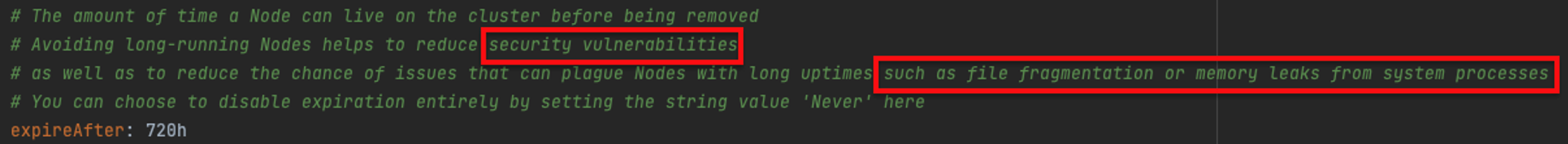 expireAfter ์ด 720h ๋ก ์ ์๋์ด ์๋๋ฐ, ๊ทธ ๋ง์ ์ฆ์จ, 30 ์ผ ๋ค์ ํด๋น ๋ ธ๋๋ฅผ ์ข ๋ฃํ๊ณ ์๋กญ๊ฒ ๋์ด๋ค๋ ์ต์ ์ ๋๋ค.