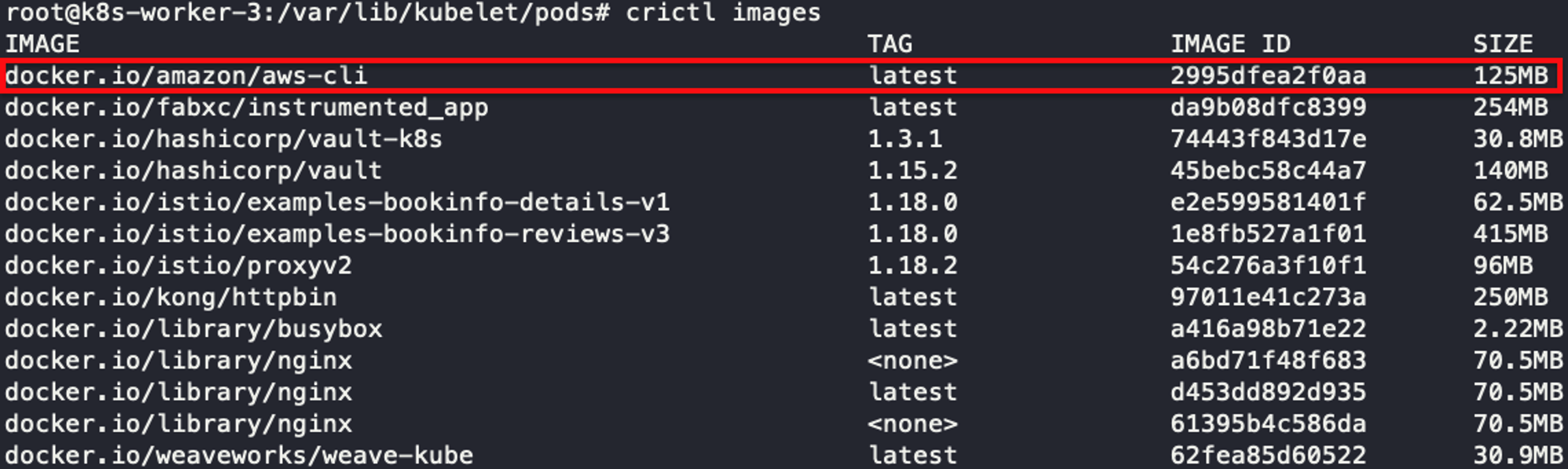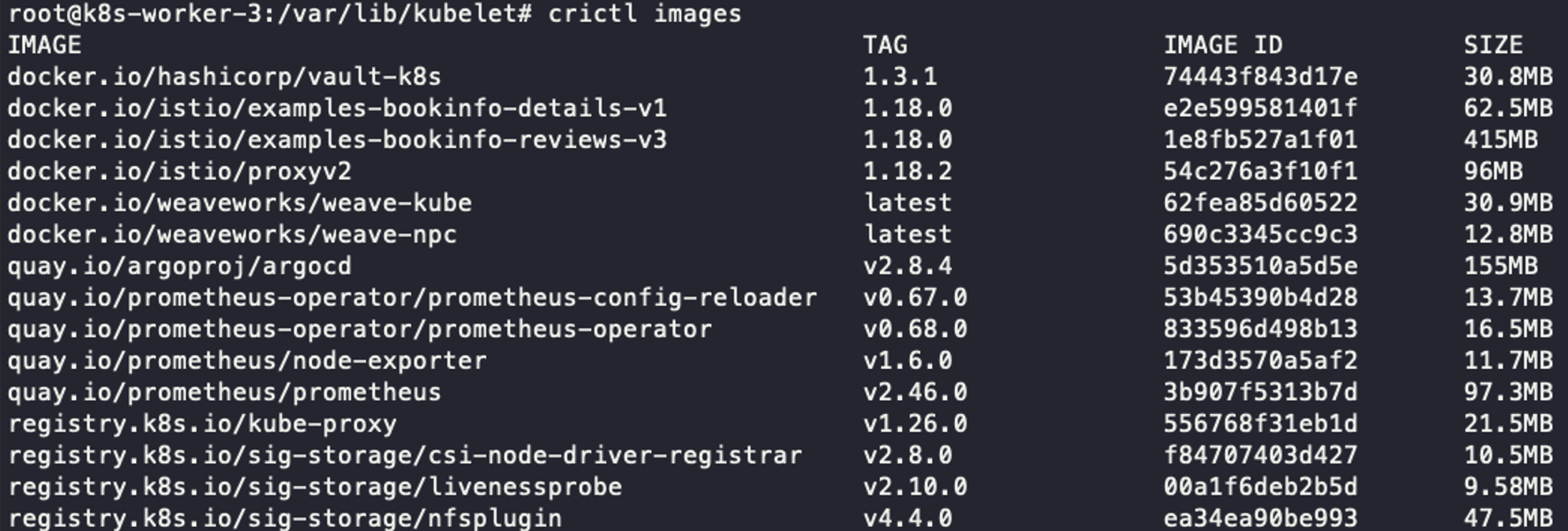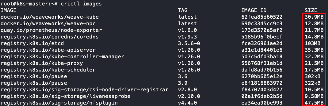 ๋ ธ๋ ์ ์ํด์ crictl ๋ช ๋ น์ด๋ฅผ ํตํด ์ด๋ฏธ์ง๋ค์ ์ฌ์ด์ฆ๋ฅผ ๋ณผ ์๊ฐ ์์ต๋๋ค.