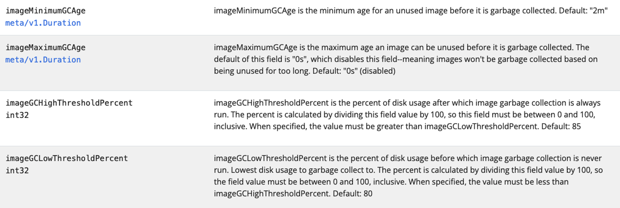 imageMinimumGCAge ์ ์ง์ ๋ ์๊ฐ๋งํผ์ ๊ฐ๋น์ง ์ปฌ๋ ํฐ์ ์ํด ์ญ์ ๋์ง ์๋ ์ต์ ์ ๋๋ค. ์ฌ๊ธฐ์ ์ค์ํ ๊ฑด imageGCHighThresholdPercent ์ imageGCLowThresholdPercent ์ ๋๋ค.