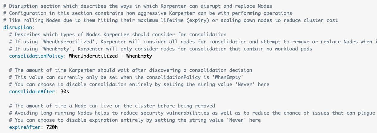 ์๋๋ Karpenter ๋ฆฌ์์ค ์ค ํ๋์ธ NodePools ์ ์ผ๋ถ๋ถ ์ ๋๋ค.