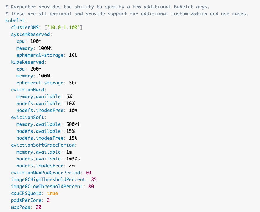 ps. Karpenter ์ NodePools ๋ก Kubelet ์ Config ๊ฐ๋ ์ค์ ํ ์ ์์ต๋๋ค!