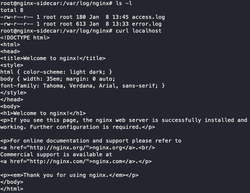 Sidecar access ์ปจํ ์ด๋๋ก ์ ์ํด์ access.log ๋ฅผ ํ์ธํด๋ณด๋ฉด ์๋์ ๊ฐ์ ๋ก๊ทธ๊ฐ ์ ๋ ฅ๋ ๊ฒ์ ํ์ธํ ์ ์์ต๋๋ค.