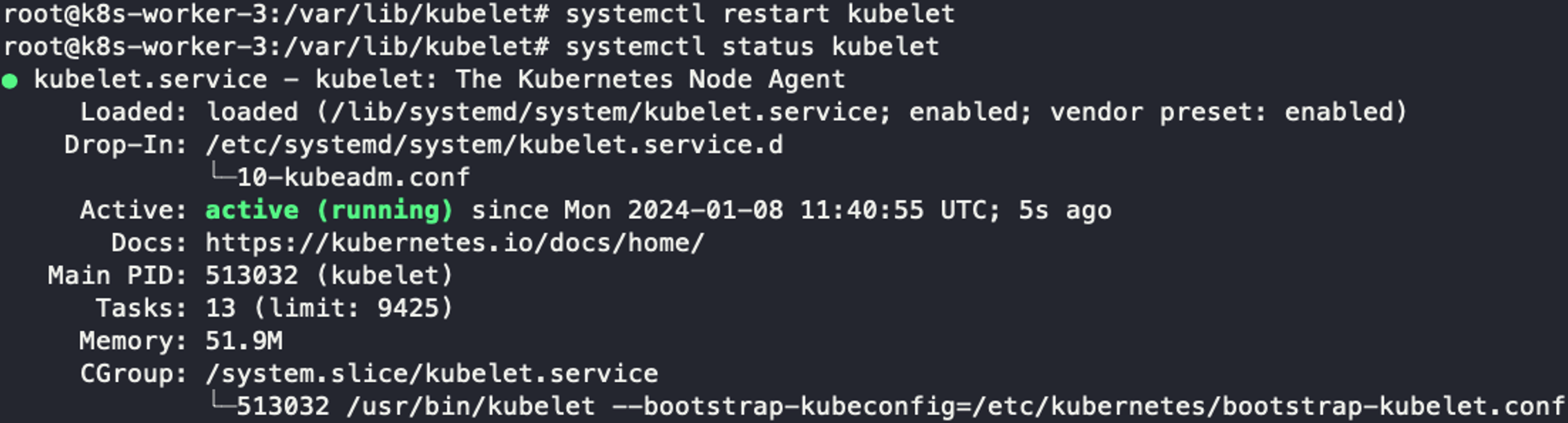 kubelet ์ ์ฌ์์ํ๋ ๋ช ๋ น์ด๋ systemctl restart kubelet ์ ๋๋ค.
