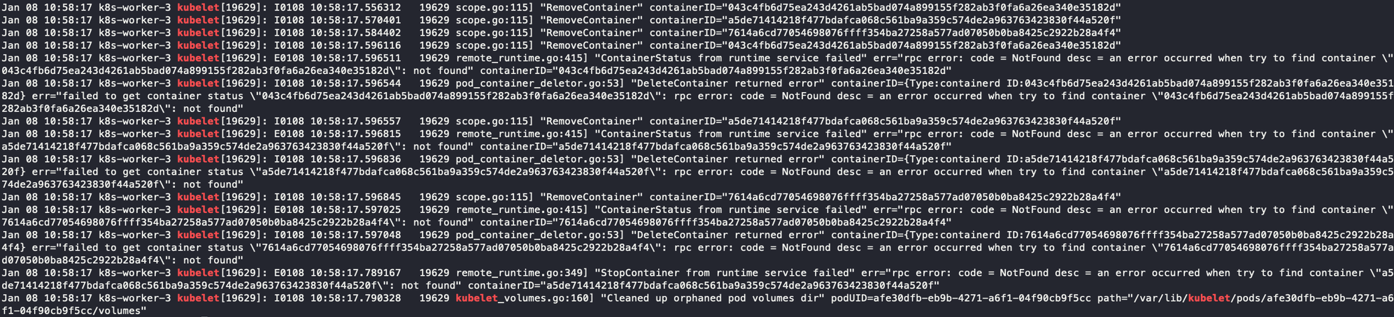 ์ดํ, ์ด์ ๋ค์ aws-cli ํ๋๋ฅผ ์ญ์ ํ๊ฒ ์ต๋๋ค. ๊ทธ๋ผ Kubelet ์ด ์๋์ ๊ฐ์ ๋ก๊ทธ๋ฅผ ์ถ๋ ฅํ๋ฉด์ ๊ด๋ จ ์ปจํ ์ด๋์ ๋ก๊ทธ๊ฐ ์ ์ฅ๋์ด ์๋ ๋ณผ๋ฅจ ๋ฑ์ ์ญ์ ํ๋ ๊ฒ์ ํ์ธ ํ ์ ์์ต๋๋ค.