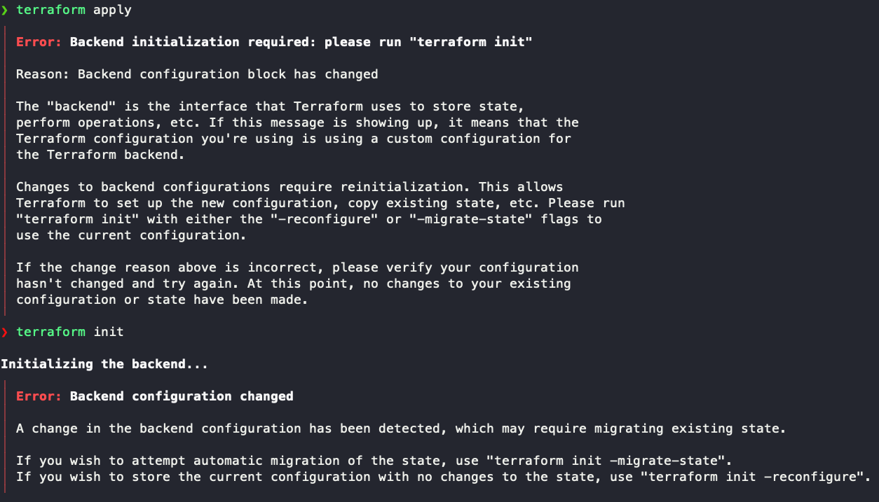 ๋ค์ ํ๋ฒ ๋ง์๋๋ฆฌ๋ฉด ์๋์ ๊ฐ์ด backend ๊ตฌ์ฑ์ ๋ณ๊ฒฝํ๋ฉด -migrate-state ์ -reconfigure ๊ด๋ จ ๋ก๊ทธ๋ฅผ ๋ณผ ์ ์์ต๋๋ค.