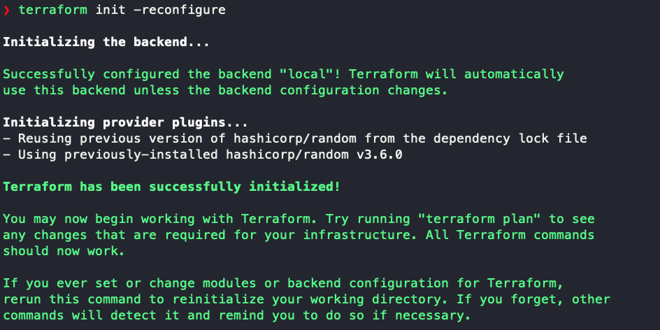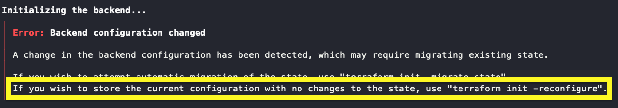 ๋ฒ์ญํด๋ณด์๋ฉด "state(tfstate ํ์ผ) ์ ๋ํ ๋ณ๊ฒฝ ์์ด ํ์ฌ์ ์ค์ ๊ฐ์ ์ ์ฅํ๊ณ ์ถ์ผ๋ฉด -reconfigure ๋ฅผ ์ฌ์ฉํด๋ผ" ์ ๋๋ค.
