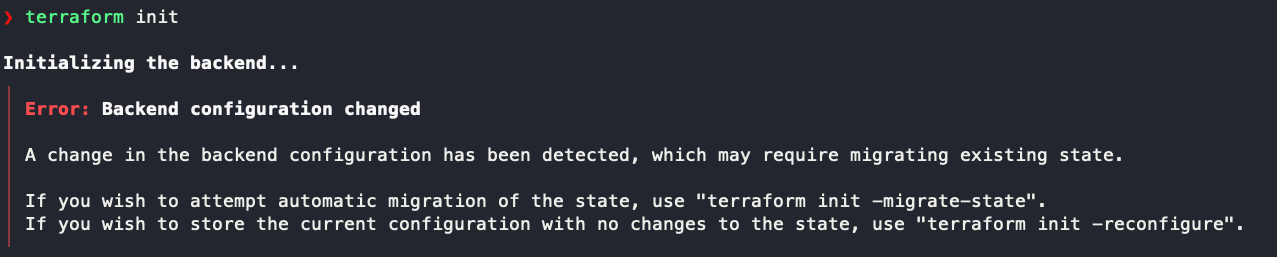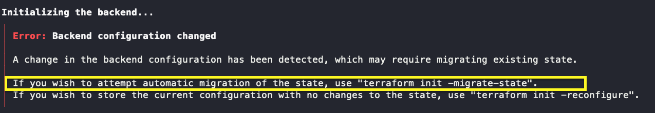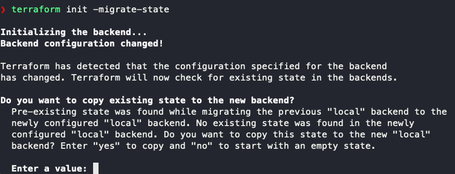 ๋ณ๊ฒฝํ ํ, terraform init -migrate-state ๋ฅผ ์ฌ์ฉํ๊ฒ ๋๋ฉด, ์๋์ ๊ฐ์ ๋ฌธ๊ตฌ๊ฐ ๋์ต๋๋ค.