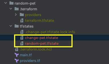 ํ์ผ ๋ด์ฉ์ ๋ณด๋ฉด backend ๊ตฌ์ฑ์ด ๋์ด ์๋๋ฐ, ํ์ฌ ./tfstates/random-pet.tfstate ๋ฅผ ๋ฐ๋ผ๋ณด๊ณ ์์ต๋๋ค.